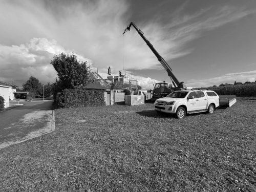Pose de la nouvelle charpente après incendie, Villa M., Fribourg.